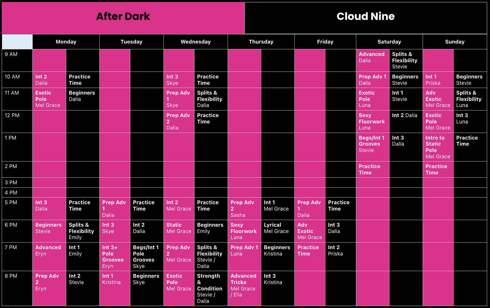 | 11 AM | Exotic Pole Mel Grace | Beginners Dalia | Prep Adv 1 Skye | Splits & Flexibility Dalia | Exotic Pole Luna | Int 1 Stevie | Adv Exotic Mel Grace | Splits & Flexibility Luna |
