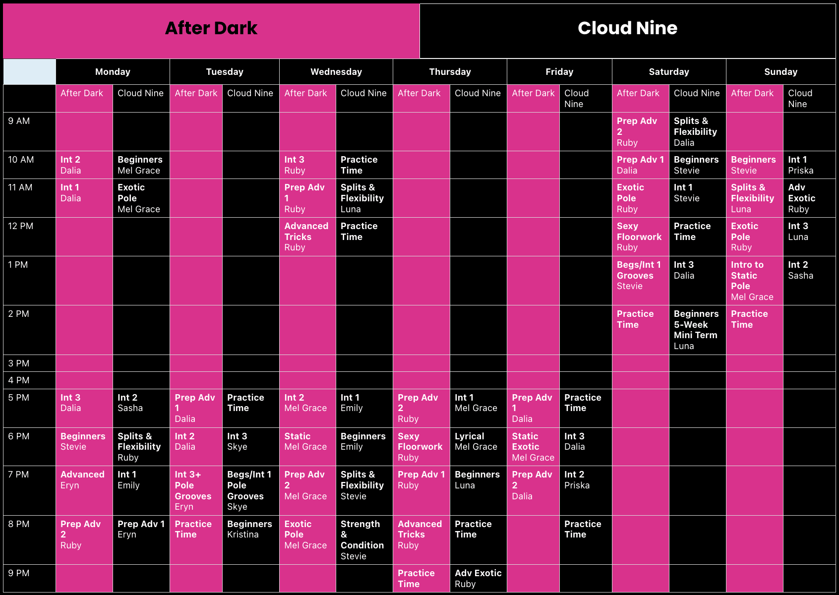 7 PM | Advanced Eryn | Int 1 Emily | Int 3+ Pole Grooves Eryn | Begs/Int 1 Pole Grooves Skye | Prep Adv 2 Mel Grace | Splits & Flexibility Stevie | Prep Adv 1 Ruby | Beginners Luna | Prep Adv 2 Dalia | Int 2 Priska | ||||